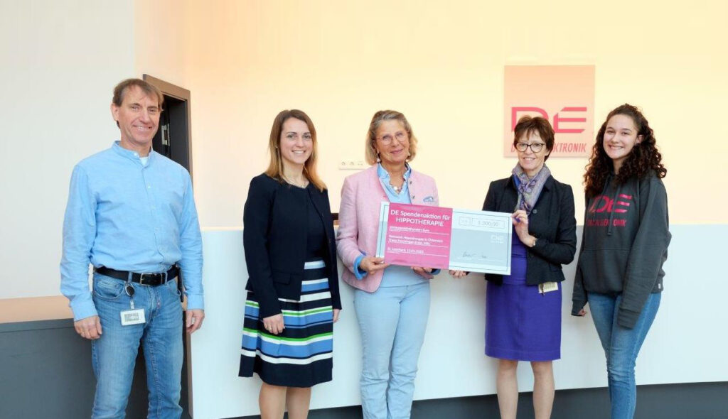 Bereits im Dezember haben die Mitarbeiterinnen und Mitarbeiter von Digital Elektronik fleißig für den guten Zweck gesammelt. Der Erlös der Aktion – € 1.300,- – geht an das Netzwerk Hippotherapie in Österreich. Stefan, Sabrina, Angela und Julia überreichen den Scheck stellvertretend für das Team von DE an Frau Thesy Feichtinger-Zrost.